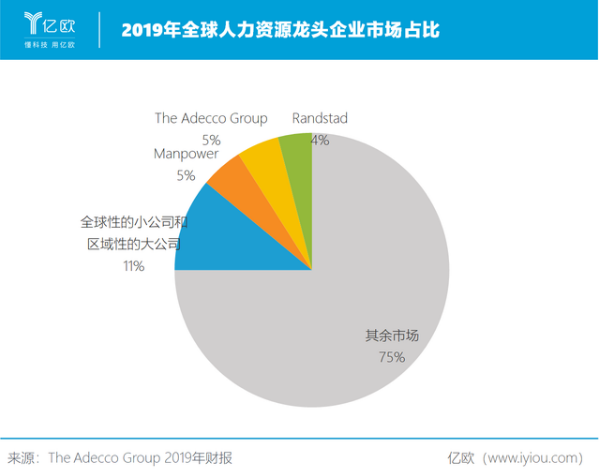 國(guó)外靈活用工市場(chǎng)發(fā)展至今已有一百多年,在最早的發(fā)源地歐美、日本等發(fā)達(dá)國(guó)家已相當(dāng)成熟,但與人力資源市場(chǎng)一樣,靈活用工市場(chǎng)非常分散。2019年,頭部前三的龍頭企業(yè)Manpower、The Adecco Group和Randstad在人力資源市場(chǎng)上的總市占率僅為14%。