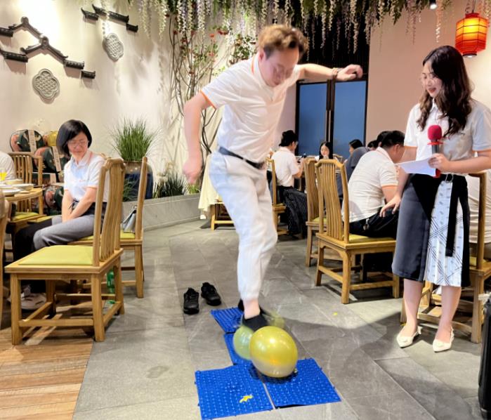 活動伊始,升級版“光腳指壓板踩氣球”游戲就讓大家為之顫抖。腳掌與指壓板的親密接觸,喚起身體最原始的感觸,在痛并快樂的游戲氛圍中,感受腳掌的“自我折磨”,在痛苦中,考驗大家斗智斗勇的智慧與敢于挑戰(zhàn)的勇氣。
